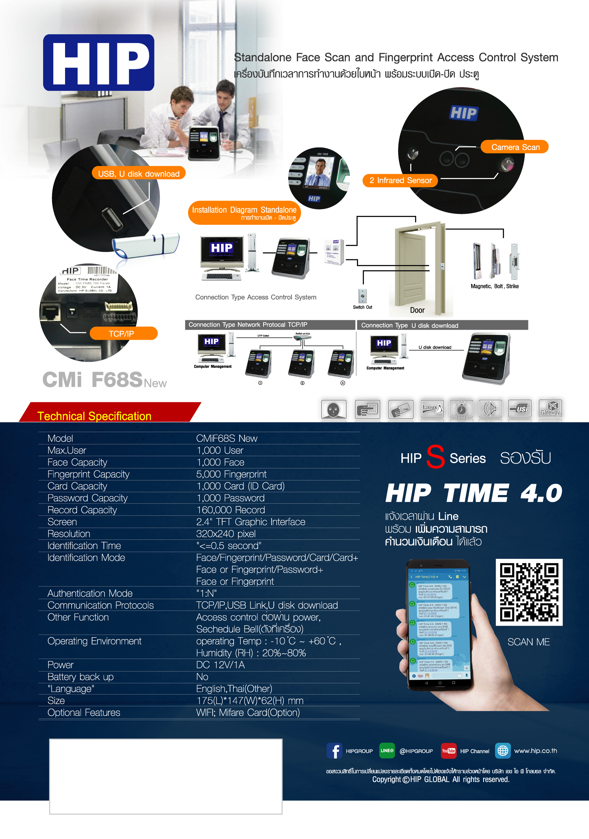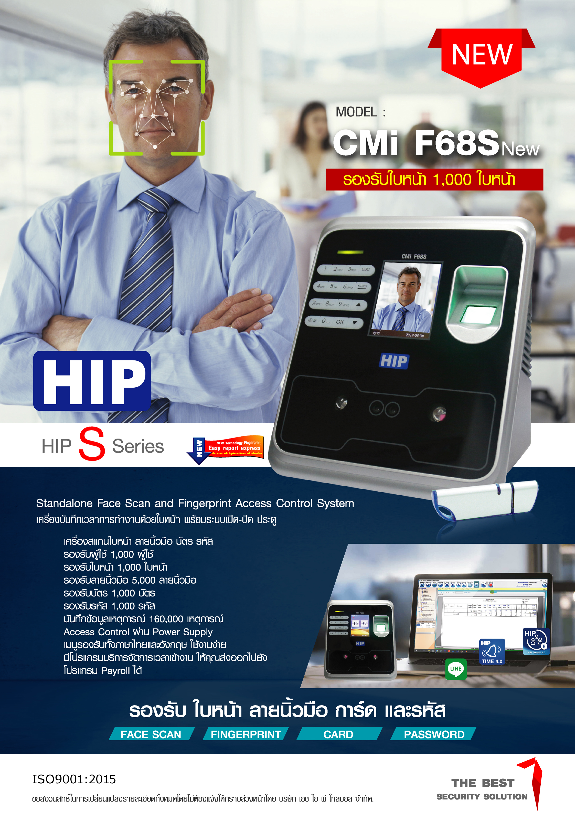 เครื่องลงเวลา HIP CMIF68s หนึ่งเดียวที่สามารถลงเวลาด้วยใบหน้า ลายนิ้วมือ รหัส หรือบัตร HIP CMI F68S เป็นเครื่องซีรีย์ เอส ที่ถูกออกแบบมาให้ใช้งานง่าย ด้วย เมนู ที่เป็นลักษณะ ไอคอน ตัวหนังสือเป็นภาษาไทย รวมถึงเสียงตอบรับเมื่อมีการสแกนเป็นภาษาไทย โดยตัวเครื่อง HIP CMIF68S สามารถบันทึกใบหน้า ได้ 1000 ใบหน้า ลายนิ้วมือ 5000 ลายนิ้วมือ มีการลงเวลา ได้ 160000 รายการสแกนลงเวลาเข้าออก นอกจากนี้ตัวเครื่อง ยังสามารถควบคุมการเปิด ประตูผ่านใบหน้าหรือลายนิ้วมือ ได้ ผ่านชุดควบคุม Door access control system ได้ ตัวเครื่อง HIP CMIF68S รองรับการเชื่อมต่อ LAN , Ethernet หรือ Flash Drive ทำให้สะดวกต่อการใช้งาน