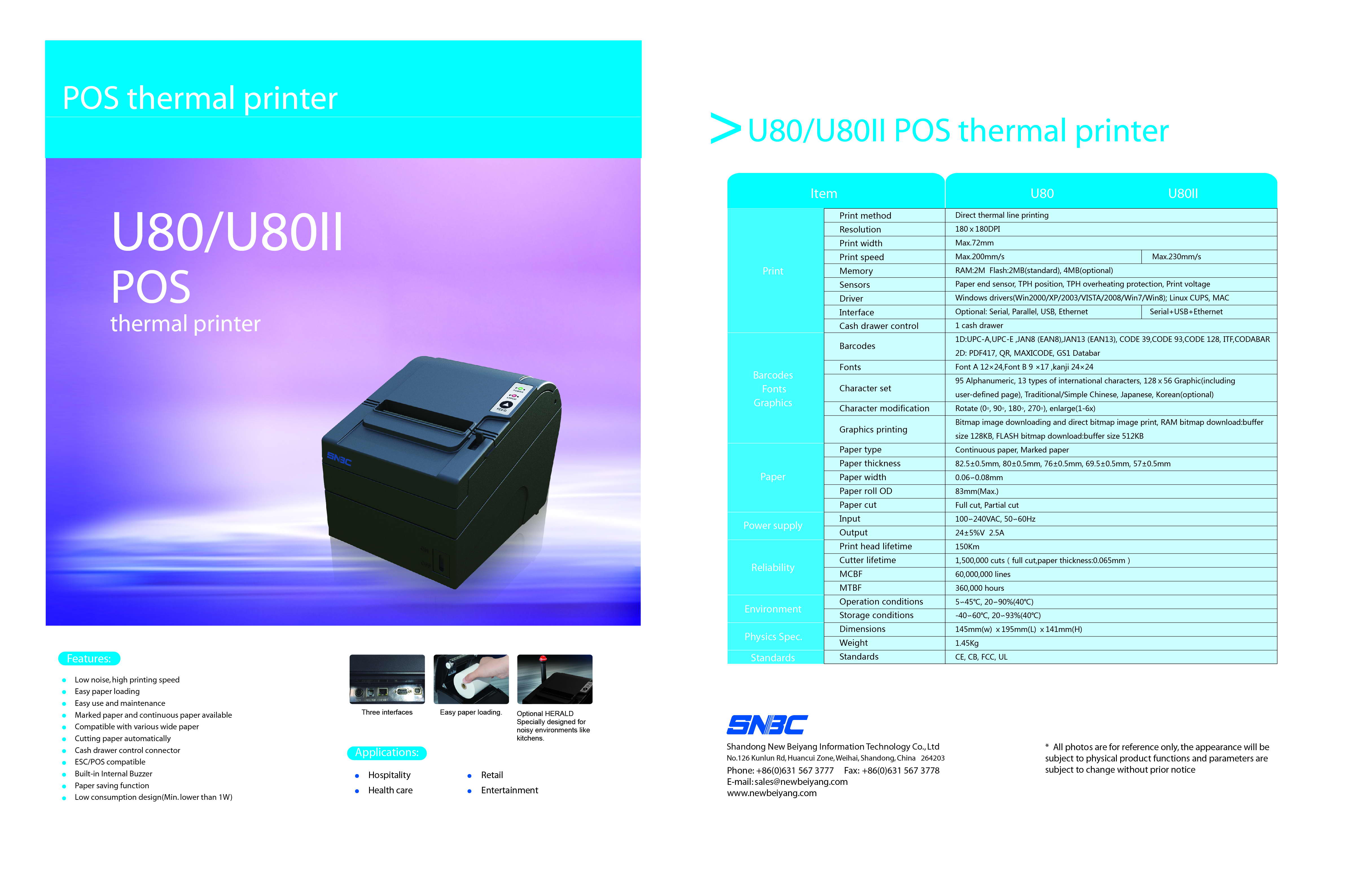 คุณสมบัติอย่างย่อ SNBC Receipt Thermal Pritner U 80II